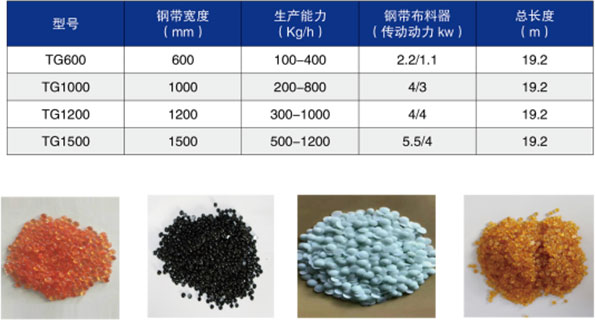 (1)采用优质进口的薄钢带,使物料能迅速冷却固化成型,循环水,不污染环境。